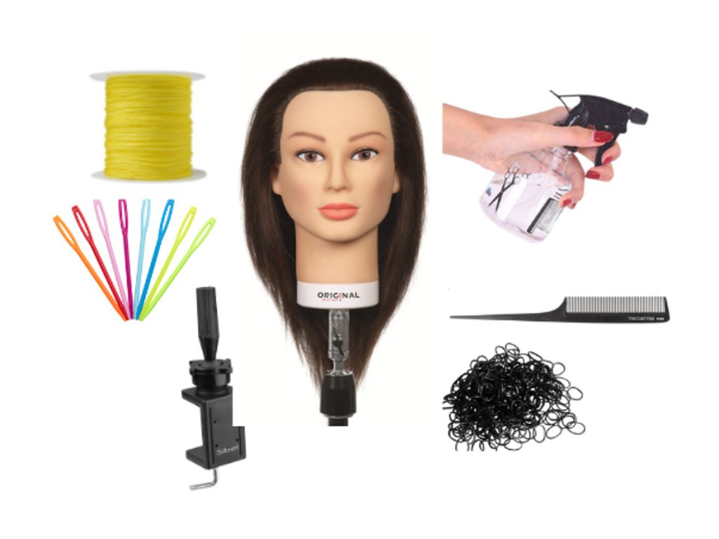 Součástí balíčku je cvičná hlava Valeska se 100% lidskými vlasy a stojan, díky kterým můžete pohodlně a stabilně pracovat. Nechybí ani profesionální hřebínek Jaguar se špičkou pro precizní oddělování pramenů, rozprašovač na zvlhčení vlasů, kvalitní malé gumičky pro zakončování copánků, plastovou jehlu pro provlékání a praktickou šňůrku (barva vybrána náhodně).